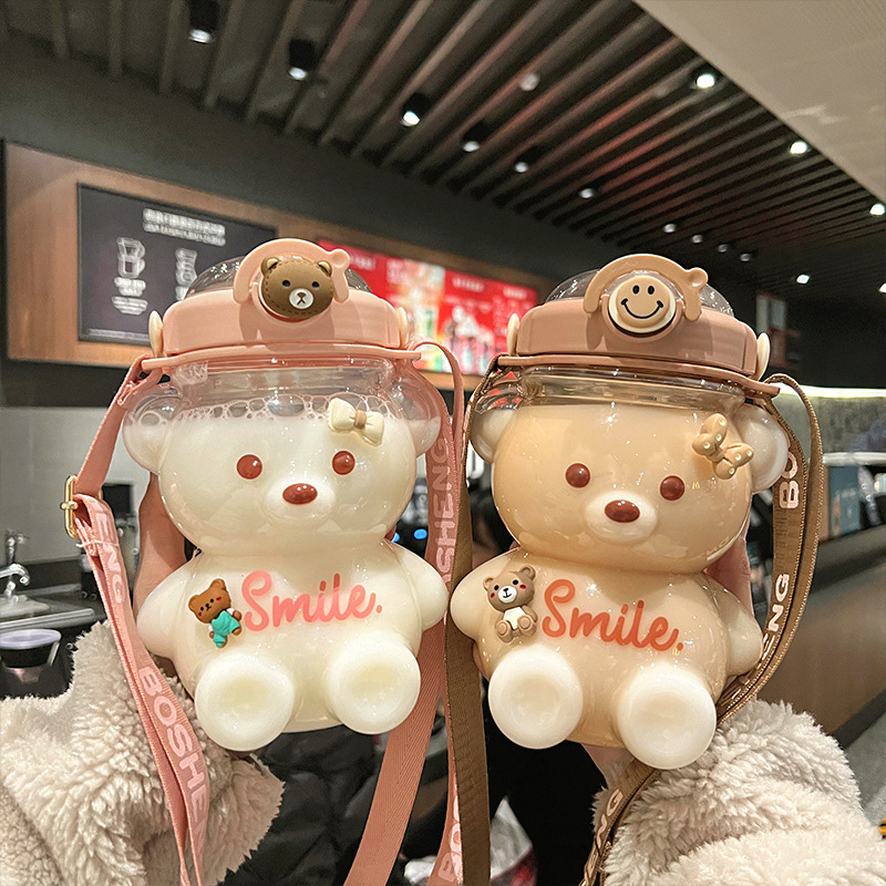 1pcs Bear Cute Aesthetic Water Bottle with Straw 1000ml, Leak Proof, Rectangle PC (Polycarbonate) Material, Hand Wash Only, PVC Free