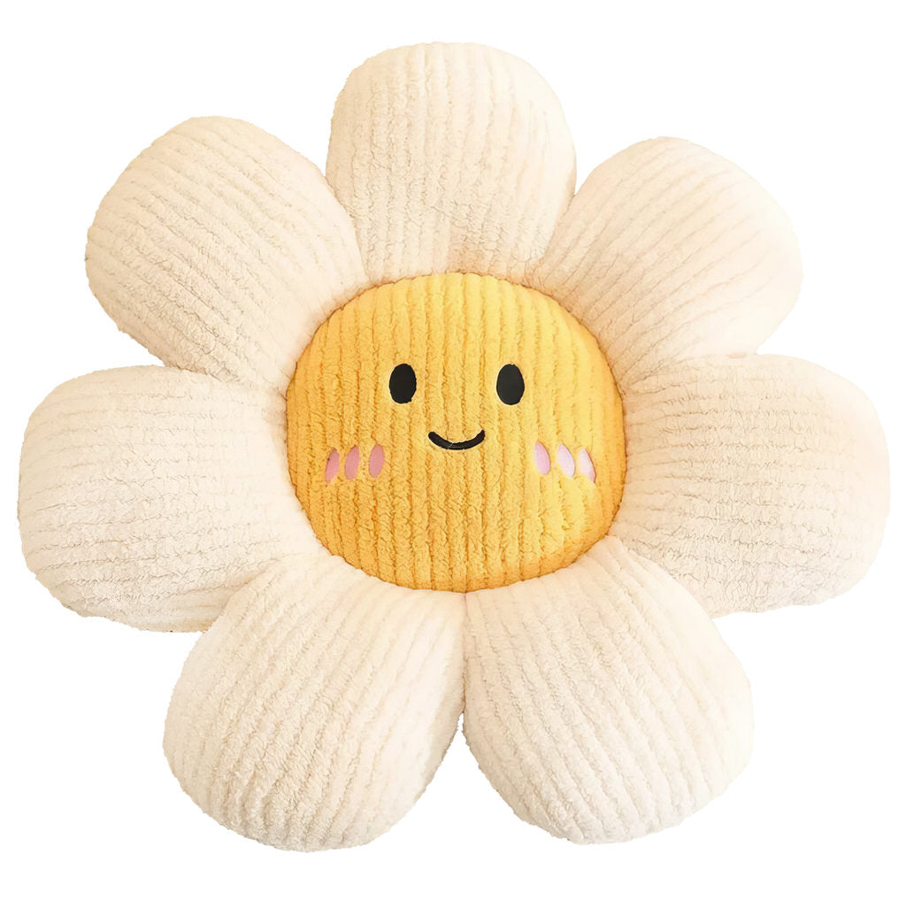 Kawaii daisy flower shaped decorative throw pillow. Creamy white or yellow petals made of a…