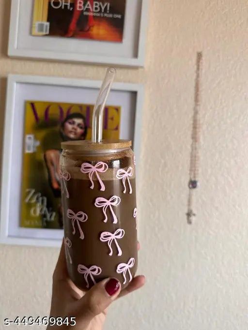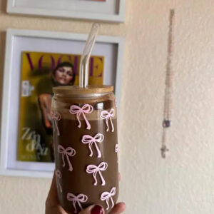 Pink bows glass cup / 16oz glass cup / glass cup with bamboo lid and glass straw/ iced coffee cup